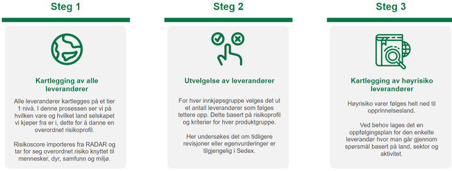 FKRA gjennomfører aktsomhetsvurderinger av egen og leverandørenes virksomhet. Det er innkjøpsdivisjonen i samråd med fagleder bærekraft som gjennomfører disse aktsomhetsvurderingene ved valg av råvarer og andre innkjøp. Det er OECD sine retningslinjer for aktsomhetsvurderinger som danner grunnlag for vår prosess, dette er en risikobasert tilnærming og innebærer prioritering av alvorlig og sannsynlig negativ påvirkning. Alle våre nye leverandører skal aktsomhetsvurderes i forbindelse med en prekvalifisering.