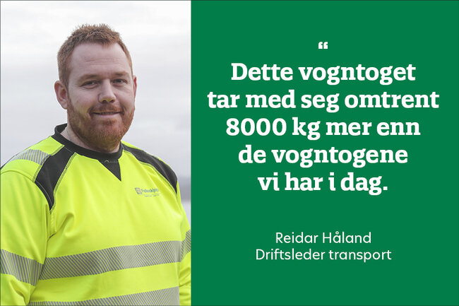 – Dette vogntoget tar med seg omtrent 8000 kg mer enn de vogntogene vi har i dag, sier Reidar Håland, driftsleder transport i FKRA. – Sammen med sjåføren bestemte vi oss for å prøve en ny akselkombinasjon med to «pusher»-akslinger. Dette fører til lavere dieselforbruk når bilen går uten last, samt en lavere vekt sammenlignet med andre akselkombinasjoner, legger Håland til.