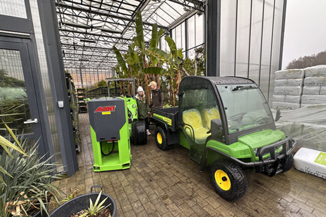 - John Deere Gatorene er modell TE, har elektrisk tipp, tett hytte med vindusvisker og de har hengerfeste, slik at de kan dra med seg planter og utstyr - noe som kommer godt med her! Smiler Ingvald Rygg, salgsleder traktor og redskap i området Sunnhordland og Rogaland.