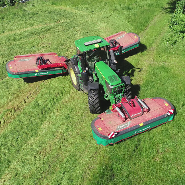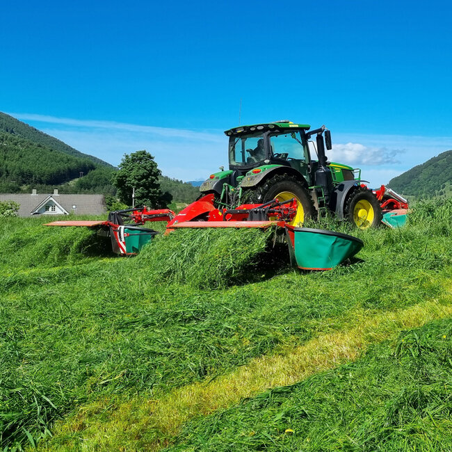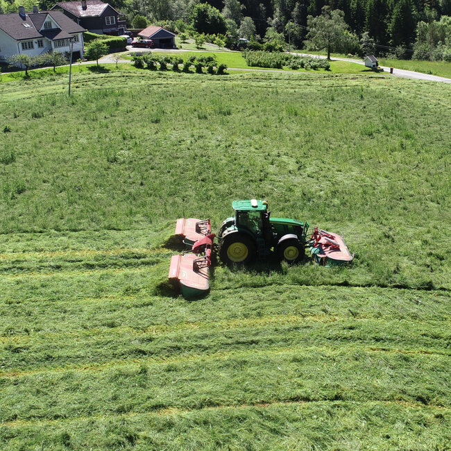 I strålande sol og fantastiske omgjevnadar sette me i gong ein Kverneland 53100MT butterfly og ein 3336FT frontslåmaskin. Slåmaskinane vert montert på kunden sin John Deere 625R. Arbeidsbredden er på heile 10,2 meter - så slåinga gjekk unna i rekord fart.